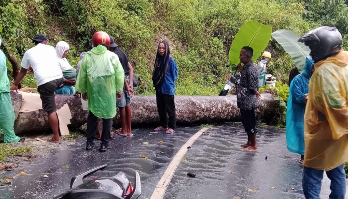 “iya pohon Kemiri yang Tumbang kita sudah mulai bersihkan untuk memudahkan para pengguna Roda untuk melintasi namun material yang longsor kami belom bisa bersihkan,” Ungakpanya
